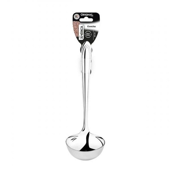 A Concha América lhe permite servir sopas, cremes, feijão, molhos e diferentes alimentos líquidos.. A peça é inteiramente produzida em aço inoxidável, um material que reúne funcionalidade e elegância: resistente e fácil de limpar. Aço Inox Capacidade: 75 ml Medidas: 22 x 7,5 Cuidados: • Para manter seus utensílios sempre brilhando, lave com esponja macia, sabão ou detergente neutro. Produtos abrasivos como palha de aço podem riscar e prejudicar o brilho • Seque imediatamente para evitar manchas • Recomenda-se o uso de água quente para melhorar o brilho • Não guarde em local úmido, a umidade pode provocar manchas.