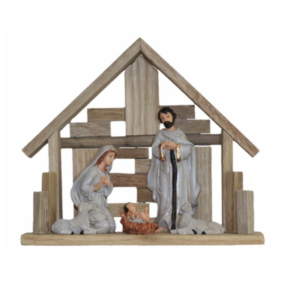 Presépio de Natal com Casinha de Madeira – 23x20cm | 5 Figuras em Poliresina com Estilo Rústico